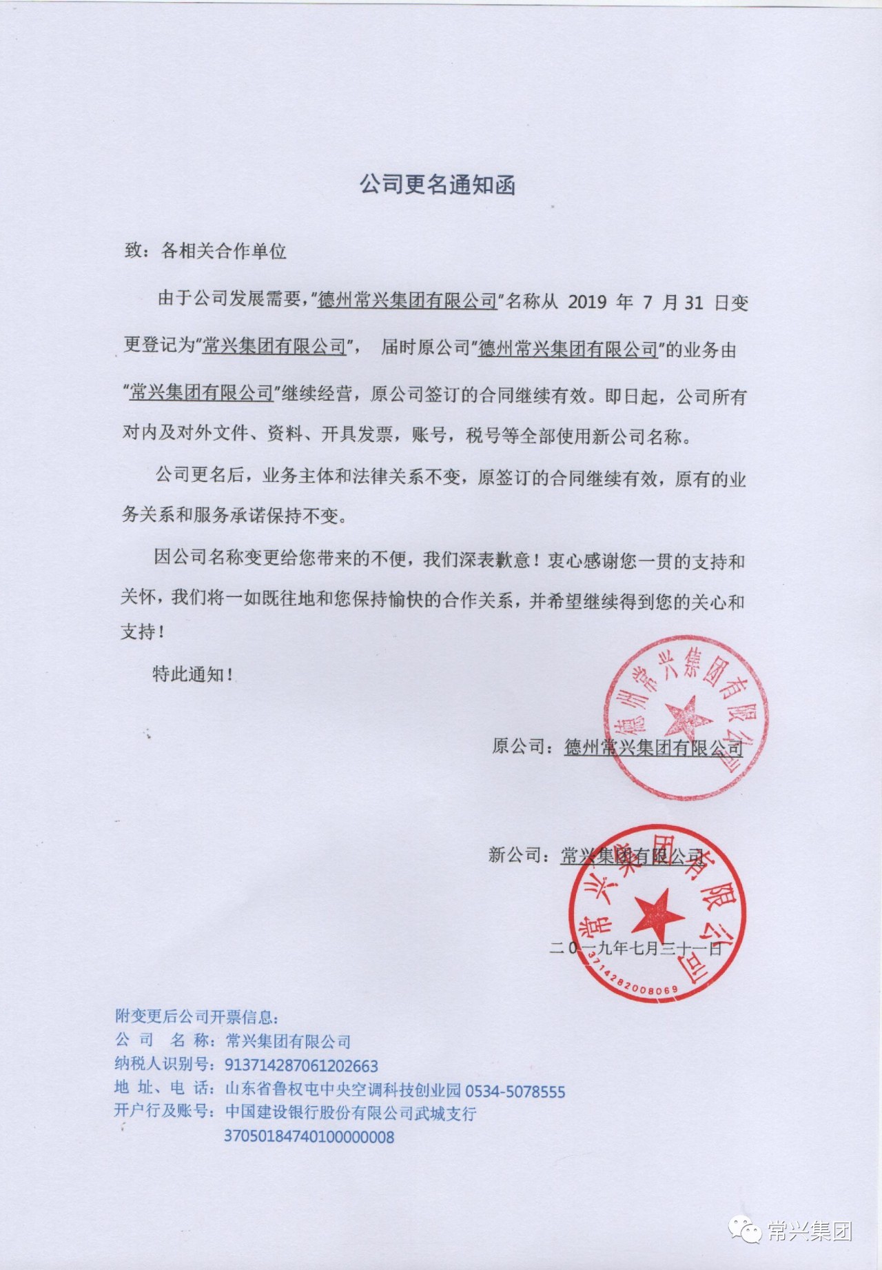 此次變更內(nèi)容僅涉及名稱,不影響本集團(tuán)及公司整體的業(yè)務(wù)結(jié)構(gòu)、職能及與您的合作經(jīng)營政策。原公司所有業(yè)務(wù)、簽訂或正在履行的合同仍然有效,公司營業(yè)地址、聯(lián)系方式不變。由于公司名稱變更給您帶來的不便,我們深表歉意。衷心地感謝您一貫的支持和厚愛,我們將一如既往地與您保持愉快的合作關(guān)系。本公司會(huì)繼續(xù)走高質(zhì)量發(fā)展戰(zhàn)略,為您提供更好的服務(wù)與支持!同時(shí),在更名之后,常興集團(tuán)有限公司將繼續(xù)履行原有業(yè)務(wù)關(guān)系和承諾,我公司衷心希望所有客戶一如既往的支持和厚愛!